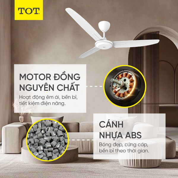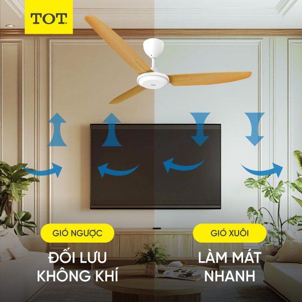 - Quạt sử dụng động cơ DC một chiều, hoạt động êm ái với 2 chiều gió phù hợp cho 2 mùa nóng/ lạnh, đồng thời tiết kiệm điện năng