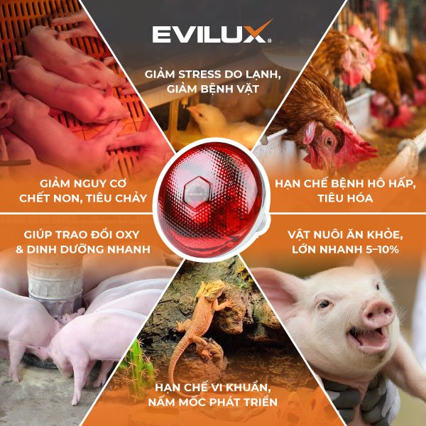 - Ngoài mục đích giữ ấm, thì việc sử dụng bóng sưởi còn góp phần giúp giảm stress, hạn chế bệnh về hô hấp, tiêu hóa cho vật nuôi. Hạn chế vi khuẩn nấm mốc phát triển,...